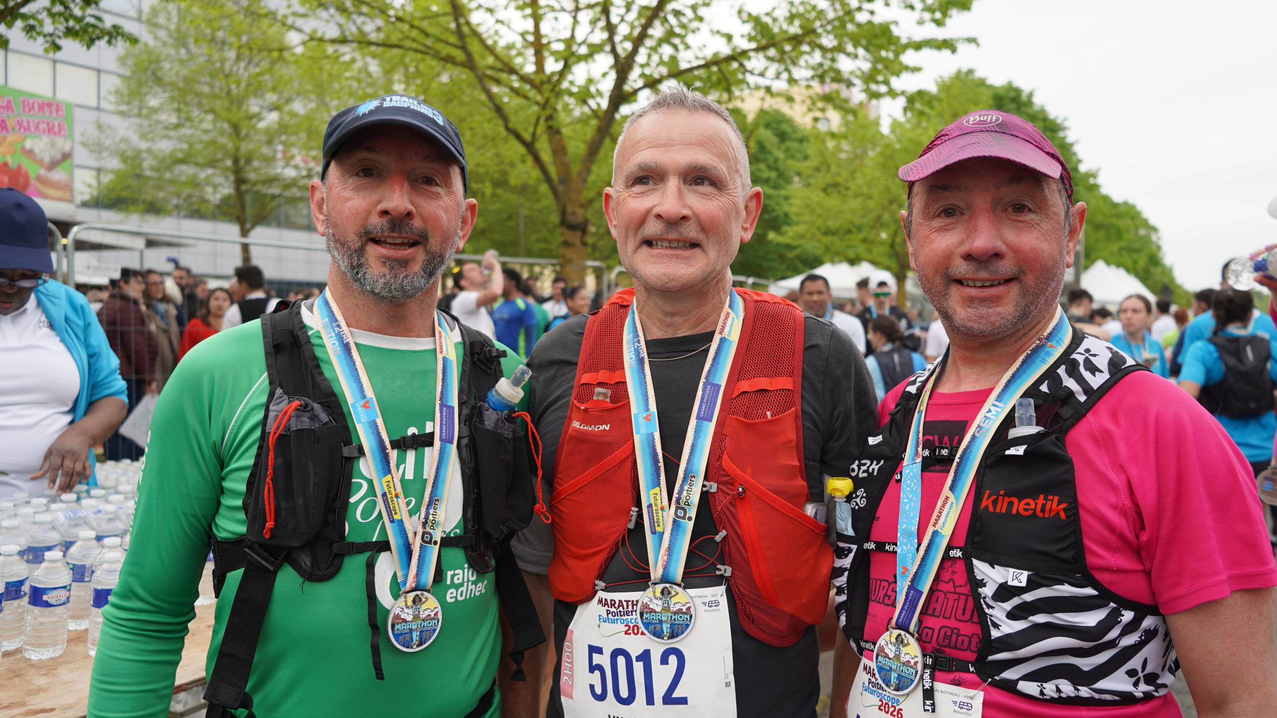Si le soleil n'était pas au rendez-vous, tous les visages, eux, rayonnaient sur l'avenue du Futuroscope. Participants malvoyants, coureurs en fauteuil ou valides : chacun a été accueilli par ses proches avec des effusions de joie à la hauteur de l'effort fourni. « Tu l'as fait ! » crie Sandrine en serrant son frère dans ses bras après son semi-marathon. Pour d'autres, l'heure était à la déception. Marianne tient sa tête dans ses mains, les yeux rivés sur sa montre connectée. Ne pas avoir battu son chrono, voilà ce qui lui pèse. Mais pour David, Nicolas et Vincent Bottreau, les « Trois Frères » réunis sur la ligne d'arrivée, peu importait le temps : « L'avoir fait, c'était bien là le principal », témoigne Vincent. « Les conditions étaient parfaites, pas de vent, pas de pluie, tout était réuni », complètent les deux jumeaux David et Nicolas.
